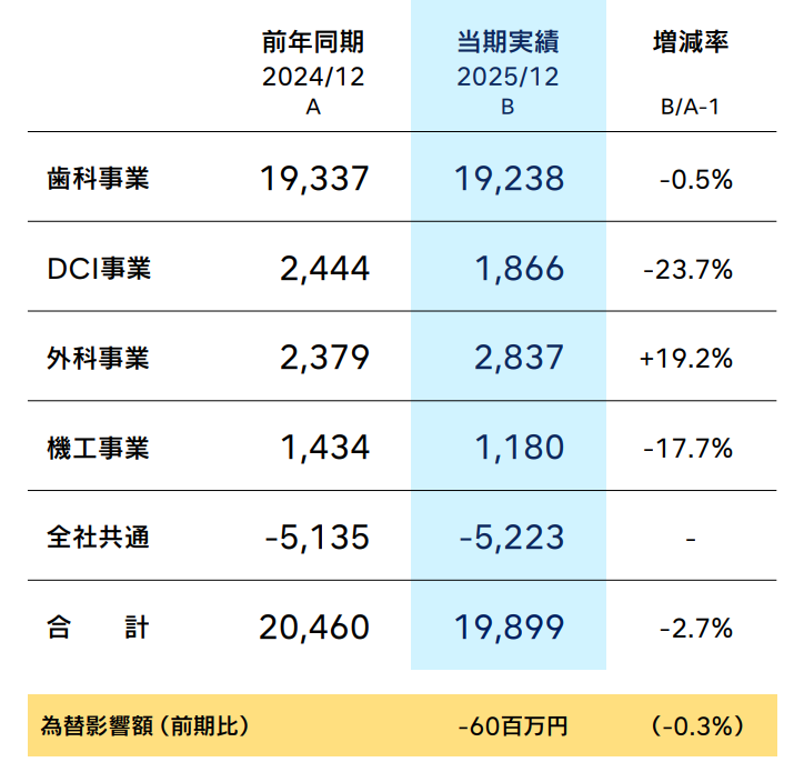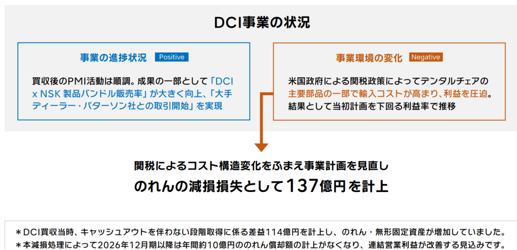 肝心の事業業績の方は、売上は微増、経常利益は多少減益でしたが、2023年度に買収したDCI事業の当初見込利益に到達できないと判断し、137億円の減損処理を行ったことにより、当期利益は-23億円の赤字になっています。