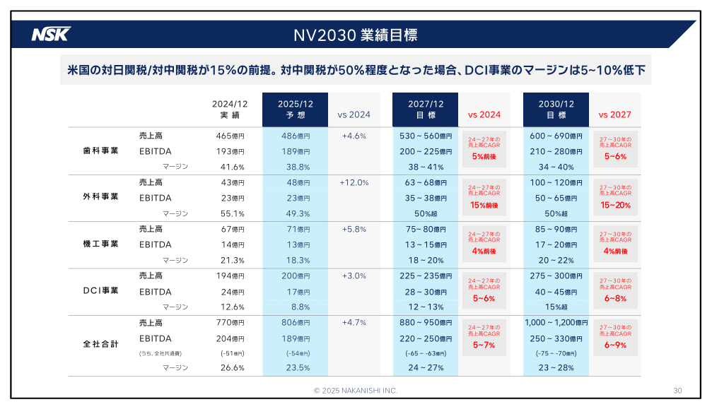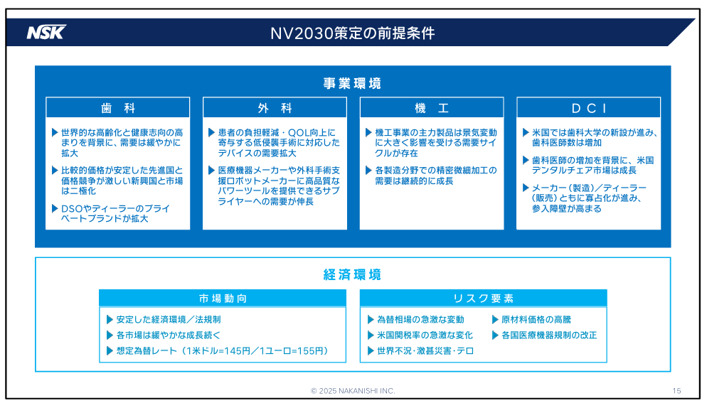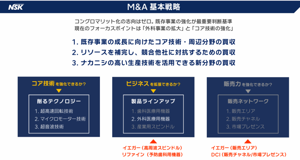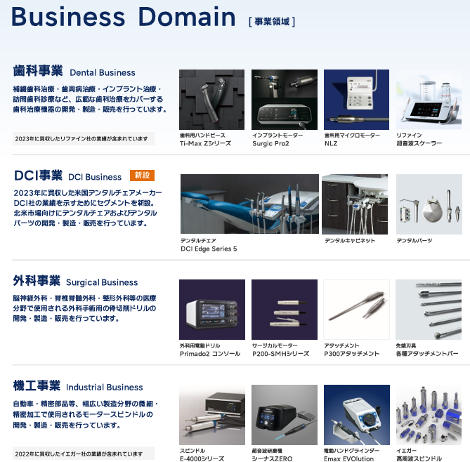 この歯科事業をメインとしながら、DSO(DentalService Organization)事業参入(歯科医院経営に付随する様々な業務、例えば、医院で使用する施設や機器のメンテナンス、歯科材料の調達)を目的としたDCIの買収、歯を削る技術の応用とした外科事業、そして微細、精密加工用のスピンドルを供給する機工事業の4つとしています。