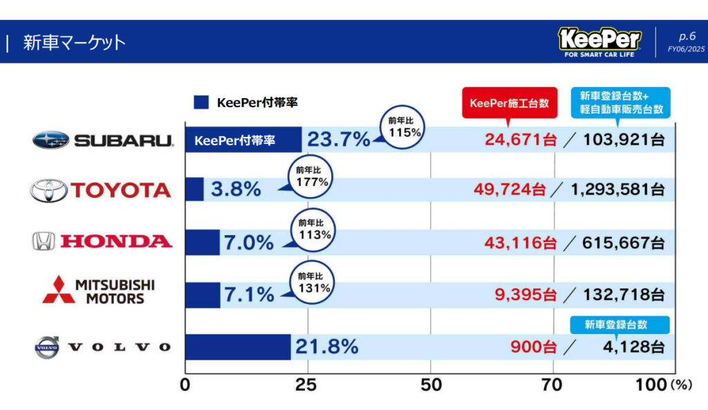 このことから、新車販売を取り扱うデイ―ラーが、キーパー技研のコーテイング技術を活用するようになり、自動車メーカー4社で順次採用が決まり、傘下でのデイーラーにて施工売上が急増しているようです。